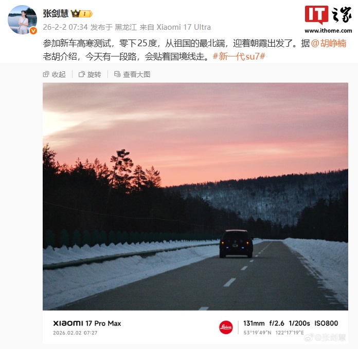 IT之家把稳到,小米集团副总裁、采购委员会主席、财富与工程贬责部总司理张剑慧当天也在微博骄慢了新车推崇,称参预新车高寒测试,今天有一段路,会贴着国境线走。其共享的图片展示了汽车动态情况,不错看到小蓝灯点亮上车。